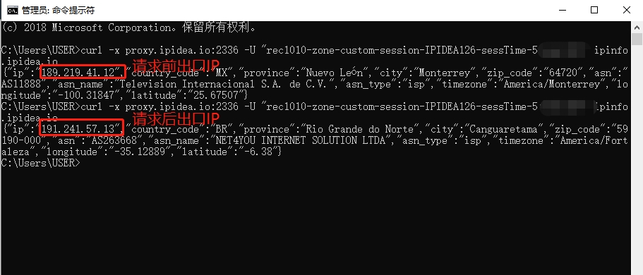 将请求切换前和请求切换后的测试命令分别复制到【命令提示符】,查看请求前后的出口IP是否改变